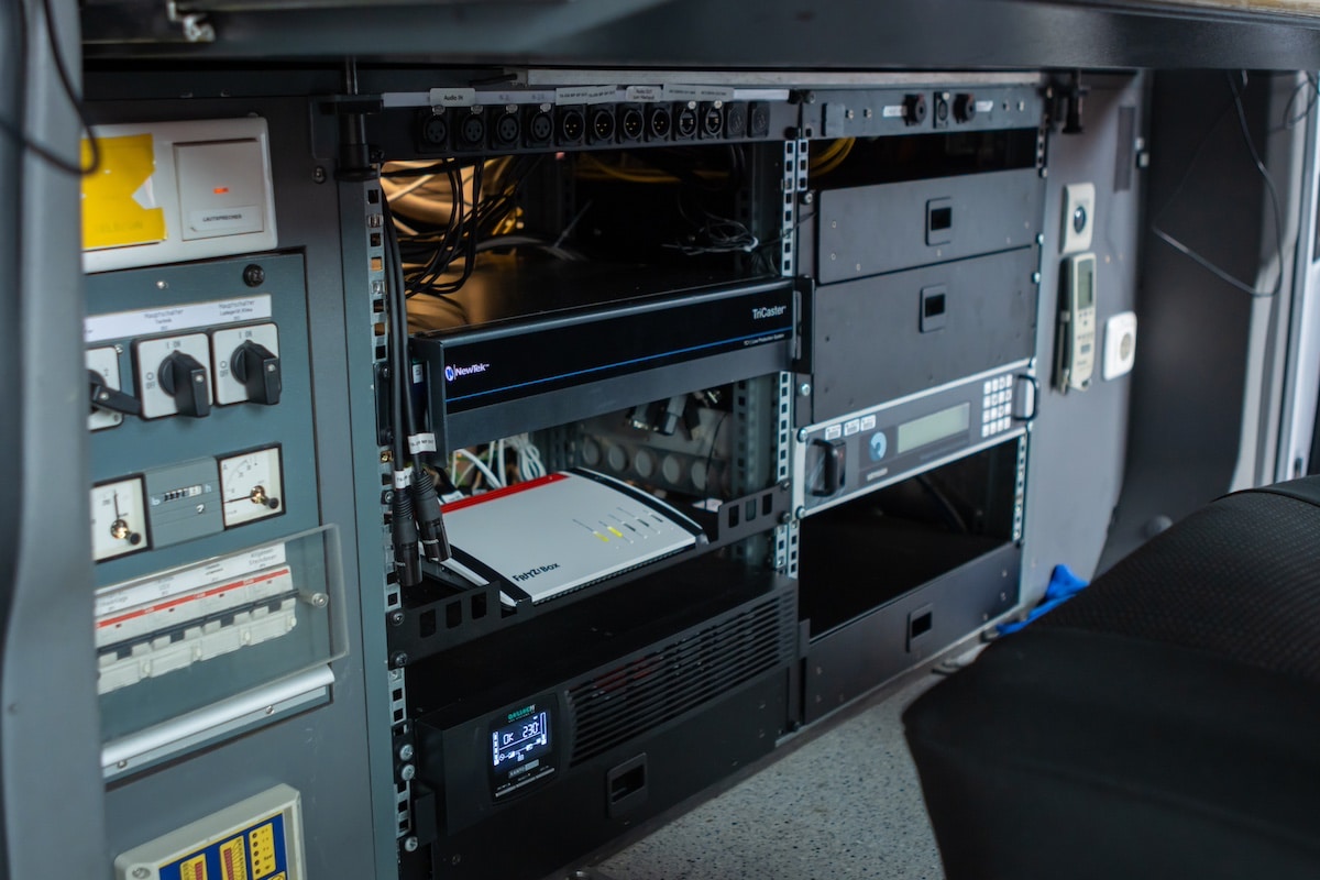 Das neue Innenleben im Rack: Bildmischer NewTek-Tricaster, die USV-Anlage ONLINE Xanto 3000R, Satellitentechnik von Satmission sowie die obligatorische FritzBox (Foto: Kai-Fabien Rolf)
