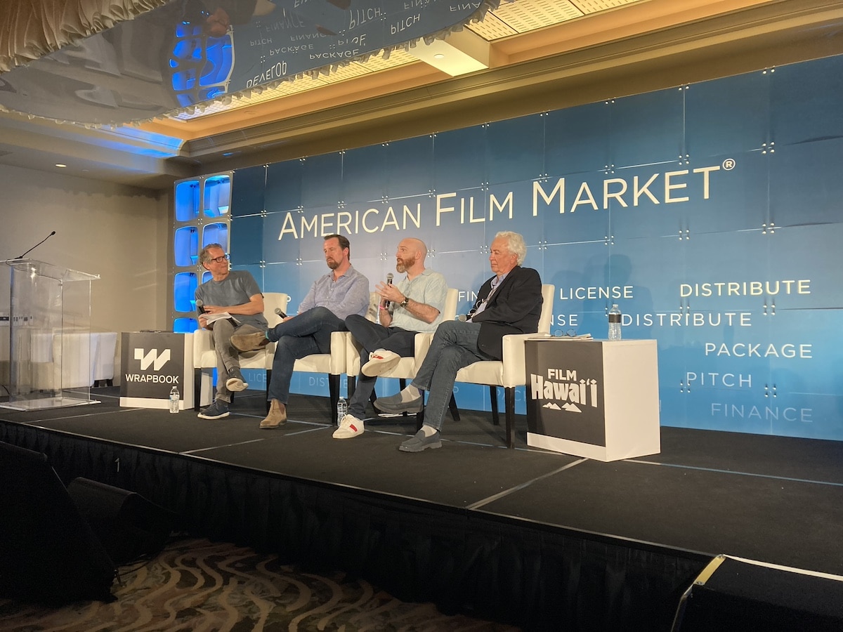 AFM Session über neue Vertriebstrends: links auf der Bühne Moderator Jeremy Kay, danach Kent Sanderson (Bleecker Street), Scott Shooman (AMC) und Produzent Jere Hausfater (Foto: Christian Genzel)