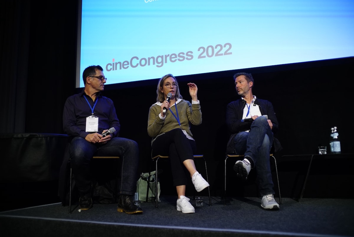 Beim Panel „Fachkräftemangel & Nachwuchssorgen: Von Arbeitsrealität und Kaufkraftverlust below the line“ auf dem CineCongress am 16. September 2022 im Audimax der HFF München begrüßte Moderator Uwe Agnes auf dem Podium Stefanie Bieker, Szenenbildnerin und Vorsitzende der Initiative Nachwuchsförderung für Filmberufe, Alexander Böhle, freiberuflicher Kameramann und Vorstandsmitglied des BVK, Matthias Haedecke, Geschäftsführer Bildgestaltung und Geschäftsbereichsleiter Bildgestaltung und Design in der Produktionsdirektion des ZDF, Frank Trautmann, Kameramann und Erster Vorsitzender des BVFK, Stefanie Wagner, Producerin bei Constantin Film sowie Jakob Zapf, Autor, Regisseur und Produzent.