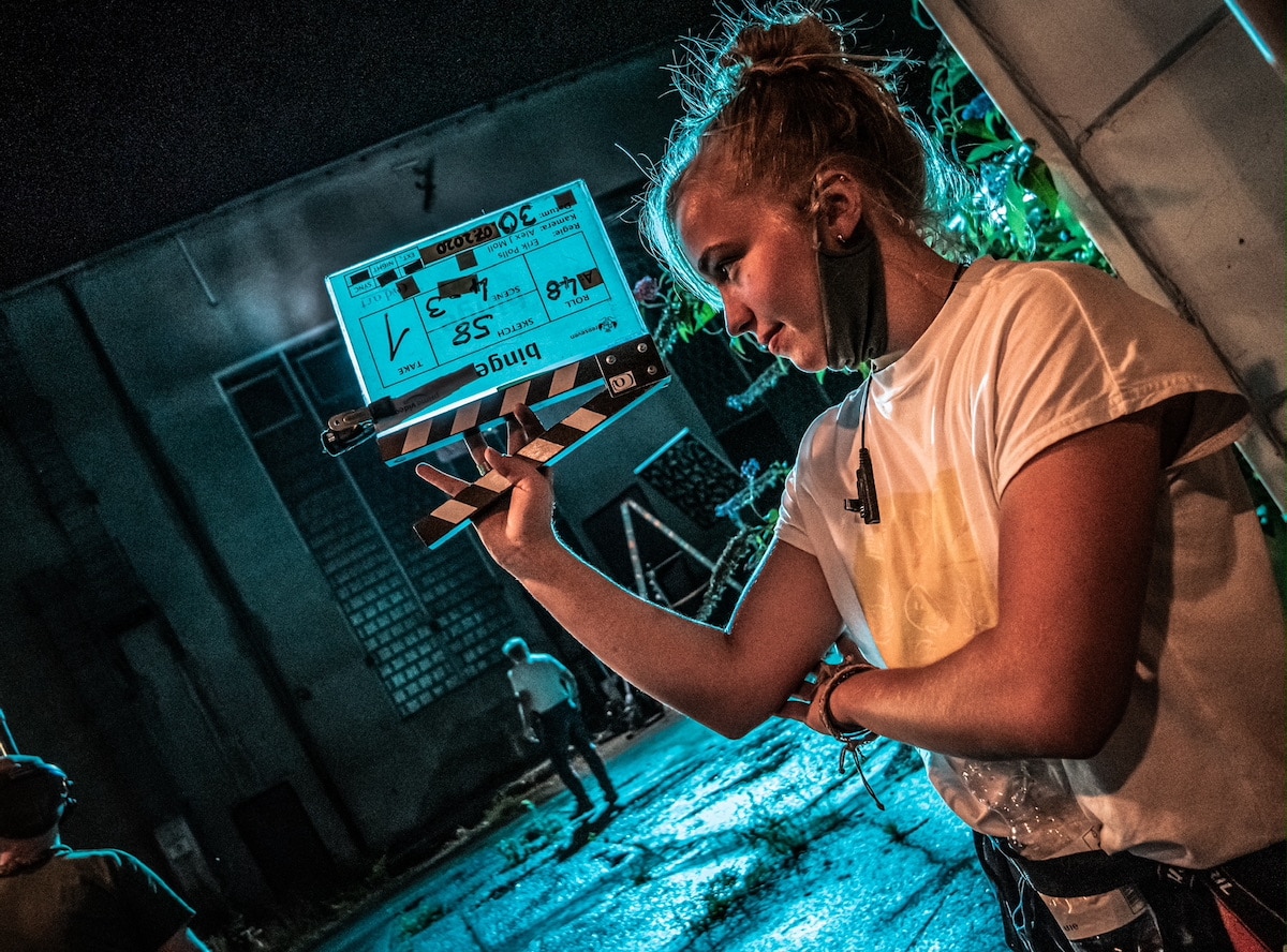 Alles rund um Kamera. Mitte 2020 bin ich mit der Ausbildung zur Mediengestalterin in die professionelle Filmwelt eingestiegen. Schon vorher habe ich No-Budget-Kurzfilme gestaltet und umgesetzt, das führe ich neben der Ausbildung fort. Die Wochen in der Berufsschule sind für mich so etwas wie „Kreativ-Urlaub“. Dann finde ich Zeit für eigene Ideen und Projekte. Momentan sitze ich an der Auflösung eines Drehbuchs zu einem 30 Minuten Filmdrama, das längste und größte Projekt, das ich bisher angegangen bin. Das Team besteht hauptsächlich aus Studenten und Freiwilligen. Leider hat die Pandemie das Projekt etwas ausgebremst, doch wir hoffen, dass wir im Herbst dieses Jahres geimpft sind und richtig loslegen können. Wenn ich nicht im Online-Unterricht sitze oder an Projekten arbeite, bin ich intensiv eingespannt in meinem Betrieb, @d Art Medienproduktion GmbH & Co. KG. Wir sind vielfältig aufgestellt. Von Produktvideos bis hin zu fiktionalen Serienformaten, wir produzieren fast alles. Die Zeit an den unterschiedlichen Sets finde ich klasse! Ich durfte schon so viele interessante Leute kennenlernen und bin an Orten gewesen, an die ich sonst vermutlich nie gelangt wäre. Für „Binge reloaded“, eine Comedy-Serie auf Amazon Prime, waren wir im Sommer viel in Köln und Umgebung unterwegs. Unschlagbar war ein Wikinger-Set, es wurde bei brüllender Hitze mitten in einen Wald auf eine Lichtung gebaut, unerreichbar für unsere LKW. Das SFX-Team hat fast den ganzen Wald benebelt. Am Nachmittag hat es dann plötzlich angefangen zu gewittern und in Strömen zu regnen. Den Tag werde ich nicht so schnell vergessen. Unsere frisch gekaufte Sony VENICE hat glücklicherweise alles heile überstanden.