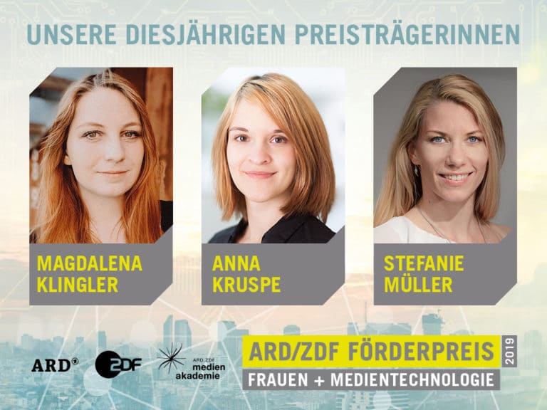 Magdalena Klingler, Anna Kruspe und Stefanie Müller sind die Gewinnerinnen des ARD/ZDF-Förderpreises. Klingler arbeitete an der TH Deggendorf im Rahmen ihrer Masterabreit am Thema „Analyse und Test alternativer Transportverfahren und neuer Protokolle für adaptives Streaming“. Anna Kruspe befasste sich bei ihrer Dissertation mit “Application of automatic speech recognition technologies to singing” an der TU Ilmenau. Stefanie Müller forschte im Zuge ihrer Dissertation an „Systematisierung und Identifizierung von Störquellen und Störerscheinungen in zeithistorischen Videodokumenten am Beispiel digitalisierter Videobestände sächsischer Lokalfernsehsender“ an der TU Chemnitz.