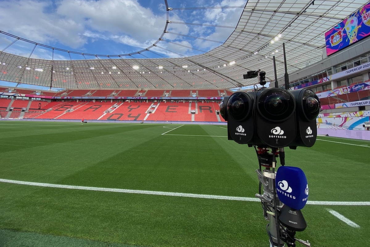 Das Startup Softseed zielt bei seinem Ansatz mehr auf das Zuschauer-Erlebnis als auf zusätzliche Informationen zum Geschehen. Das deutsche Unternehmen entwickelte dazu das 360-Grad-Kamerasystem Plaiground, das in der Lage ist, das Spiel mit einem angesichts des technischen Aufwands geringem Zeitversatz in die Apple Vision Pro zu senden. Dazu gelangen die Signale von den Kameras via Glasfaser zu den Encodern und kommen nach der Verarbeitung der Daten 35 Sekunden später in der VR-Brille an. So entsteht eine 360-Grad-Rundumsicht vom Spielfeldrand, bei der die Latenz von gut einer halben Minute nur dann stört, wenn der Nachbar schon lautstark jubelt, während das Tor in der Brille noch gar nicht gefallen ist.