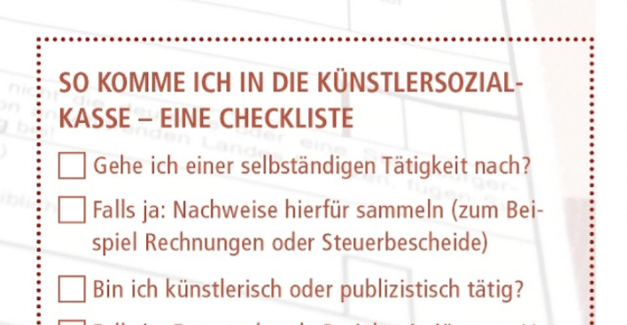 Darüber, wie man am besten in die Künstlersozialkasse kommt, besteht manchmal im besten Fall Unsicherheit. Mitunter begegnet man auch Übertreibungen und echten Falschinformationen. In unserer Ausgabe 9.2018 gab es eine Checkliste zum Abhaken.