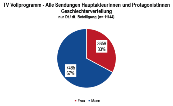 Beim TV Vollprogramm fiel sofort auf, dass nur rund ein Drittel der 11.144 erfassten Protagonistinnen, Protagonisten und Hauptfiguren, mit Frauen besetzt wurden. Bei den deutschen Kinofilmen wurden insgesamt 1.318 Rollen erfasst, von denen immerhin 42 Prozent von Schauspielerinnen verkörpert wurden. Am gravierendsten ist der Unterschied allerdings im Kinderfernsehen. Hier nehmen Frauen grade einmal rund 28 Prozent der Präsenz ein. Das einzige Genre, indem mehr Frauen als Männer besetzt werden, sind die Soaps und Telenovelas mit rund 52 Prozent Frauenanteil.
