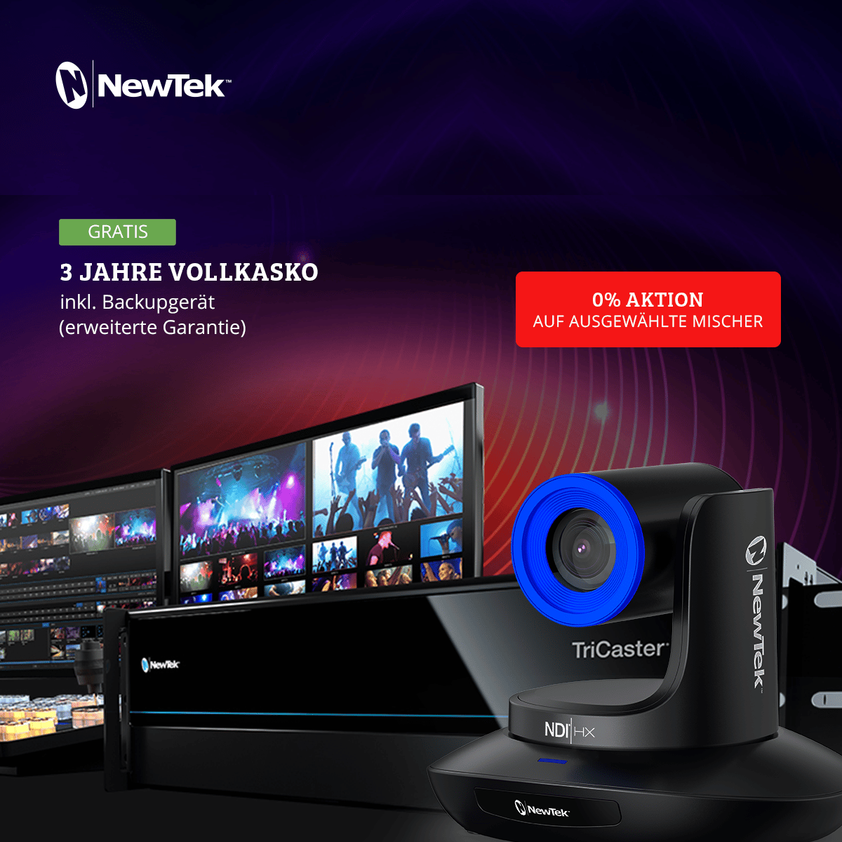 Für mehr Flexibilität in der Produktion und Liquidität sorgt die 0% Aktion auf ausgewählte NewTek-Neugeräte, die mit der kostenfreien Teltec Vollkasko-Aktion auf NewTek-Neugeräte kombinierbar ist. Die Teltec NewTek Certified Solutions Experts beraten und helfen gerne bei der richtigen Konfiguration der Systeme, damit Content nicht nur zuverlässig, sondern langfristig auch kostensenkend produziert wird.