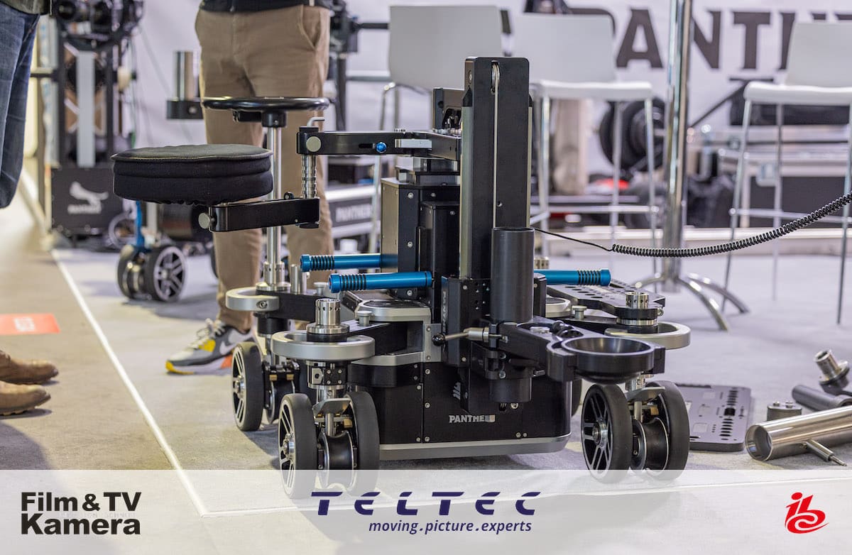 Der neue X-Type-Dolly zeigt bis ins Detail durchdachte Lösungen für schnelles und zeitsparendes Arbeiten am Set. Er lässt sich mit ohne Mittelsäule verwenden und der Umbau auf die Konfiguration mit einer Basisplatte ist rasch getan. Die Dolly-Säule verfügt über ein um 360 Grad drehbares High-Low-Turnstile, mit dem sich für vielfältige Anwendungen realisieren lassen und das eine niedrige Kameraposition bietet. In Sekundenschnelle, so Panther, könne es in eine niedrigere oder höhere Position verschoben werden, ohne dass dabei die Kamera von der Dolly entfernt werden müsste. Die Ergonomie wurde dank des drehbaren Sitzes verbessert, der nun unabhängig von der Kamerasäule eingestellt werden kann. Ein optionale Crab & Steer Kit bietet mit Steuer, Grab, Front und Bear vier verschiedene Lenkmodi.