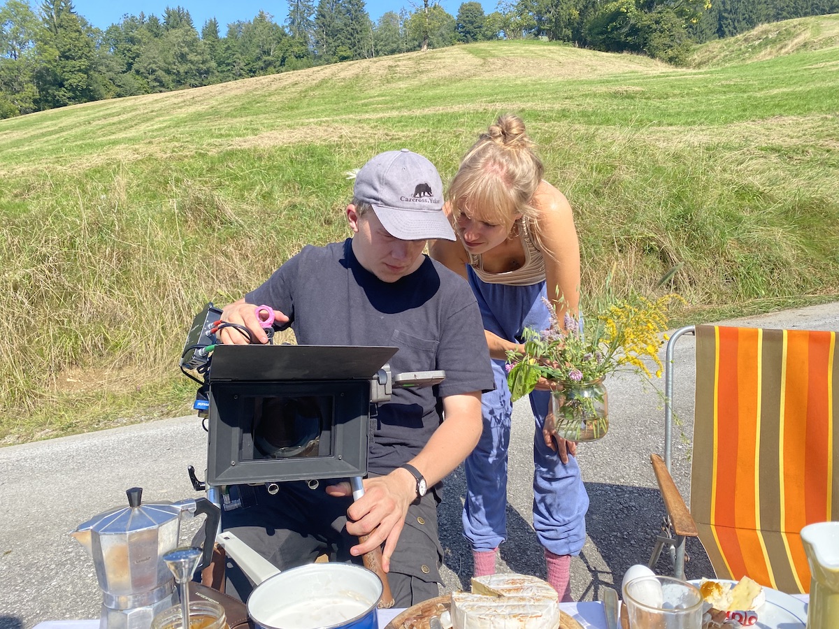 Wir haben in den Tiroler Bergen gedreht. Aufgrund des kleinen Budgets bei diesem Projekt waren drei Drehtage mit kleinem, freundschaftlichem Team angesetzt. So mussten alle anpacken und teilweise auch mehrere Aufgaben übernehmen. Auch für Fanny war es eine kleine Herausforderung, ihren Vater und ihre Schwester zu überzeugen, da überhaupt mitzumachen, weil sie beide keine professionellen Schauspieler:innen sind. Doch ich glaube, nach der ersten Eingewöhnungsphase hat es den beiden großen Spaß gemacht. Obwohl es sich um einen fiktionalen Film handelt, waren die Figuren ihnen sehr nah, was den Prozess sicher erleichtert hat. Da waren wir alle sehr beeindruckt.