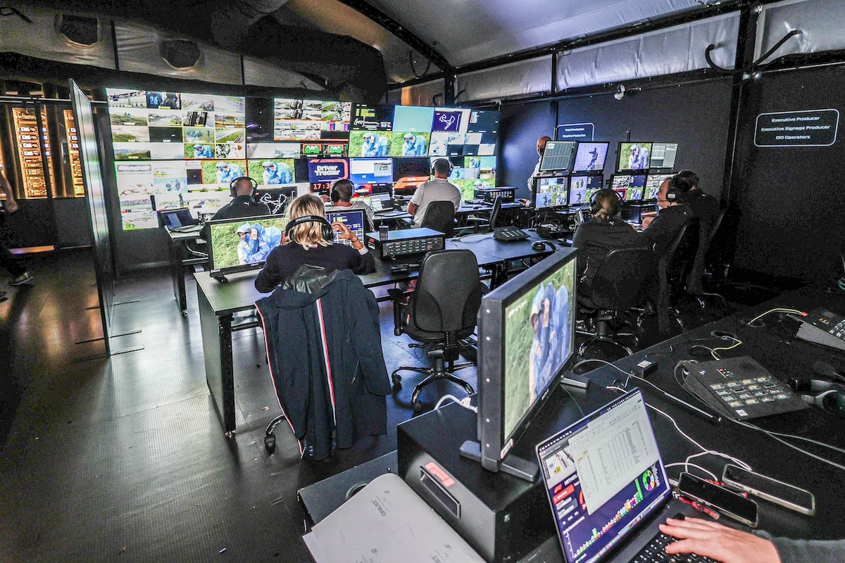 Die Broadcast-Produktion der Formel 1 beginnt für jedes Rennen mit dem Aufbau des mobilen Event Technology Centre (ETC) an der jeweiligen Strecke. In Zandvoort erstreckte sich dieses Zentrum über eine Fläche von 428 Quadratmetern. Hier koordinieren rund 80 technische Mitarbeiterinnen und Mitarbeiter die Aufnahmen und Datensignale, die für die Übertragung gesammelt werden. Das ETC ist das Herzstück vor Ort und fungiert als Knoten- punkt für die Signale der Kameras, Mikrofone und Telemetriedaten, die anschließend über Glasfaserkabel an das Media & Technology Centre in Kent weitergeleitet werden.