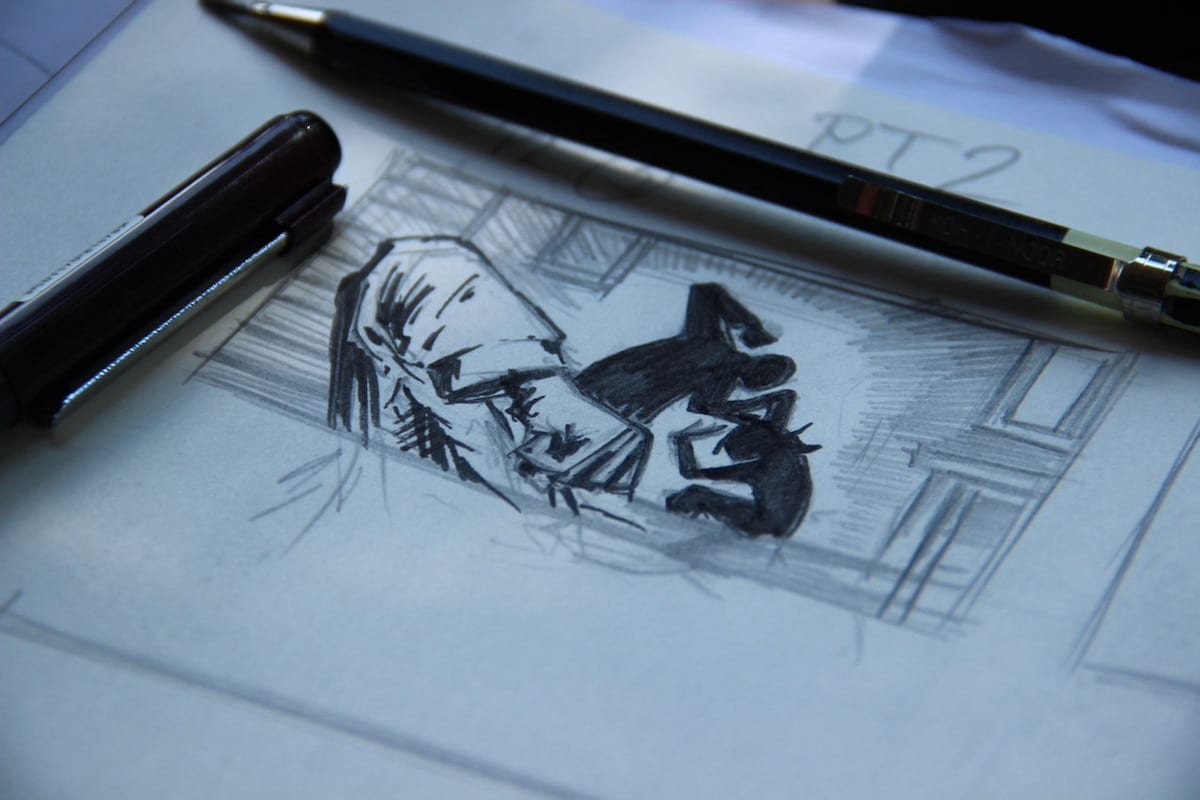 Der Arbeitsprozess bei der NDR-Doku „Protokoll einer Zwangsehe“ von Rohzeichnung über Photoshopbild bis zur fertigen Szene. (Fotos: Timo Landsiedel)