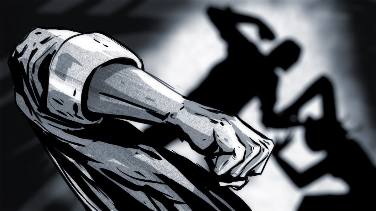 Die groben Striche des digitalen Pinsels skizzieren eine Gestalt. Es ist die Silhouette eines Mannes, sein Schatten. Mit erhobenem Arm und zur Faust geballten Hand steht er über einer zierlicheren Gestalt. Seine linke Hand hat sie am Kopf gepackt, hält die Haare fest im Griff. Auch die Frau ist nur eine Silhouette, kauert, das Handgelenk des Angreifers haltend, die andere Hand schützend über den Kopf gehalten. Vor dem Schatten beider Gestalten ist eine geballte Faust sichtbar. Auch sie ist mit groben Strichen gezeichnet, das Hemd ist hochgekrempelt, der Arm bewegt sich, zum Schlag ausholend.