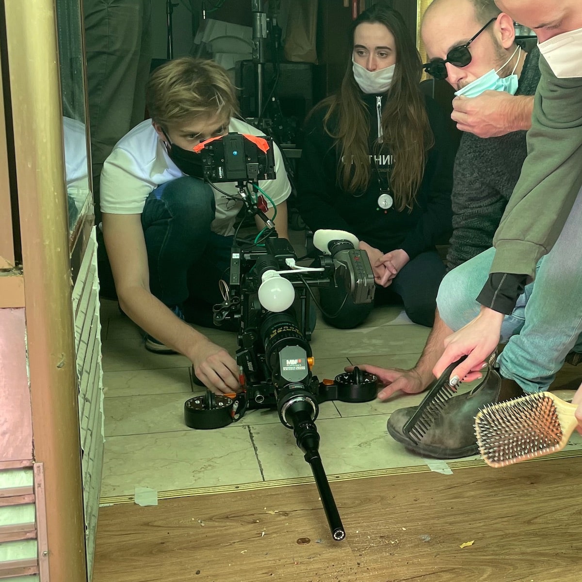 Damit wir auch der Münze in dunkle und enge Orte folgen können, haben wir ein Periskop benutzt, um mit der Kamera auf Bodenhöhe und unter Küchenanrichten zu kommen. Nach vielen Tests und Überlegungen, wie wir uns synchron mit der Münze um die eigene Achse drehen können, sind wir auf den Scater Scope gestoßen, eine Art Schnorchel mit integriertem Spiegelelement, den man beispielsweise mit einem Funkschärfemotor steuern kann. Wir konnten damit das Bild drehen, ohne dabei die Kamera selbst drehen zu müssen. Wir haben dann sehr viele Münzen geworfen und versucht, dass wir nicht nur den Drehmoment der Münze genau treffen, sondern auch in der richtigen Geschwindigkeit neben der Münze herfahren. Das hatte in allen Tests erstaunlich gut funktioniert, aber im eingeleuchteten Set hatte die Münze ein plötzliches Eigenleben entwickelt und wir haben einige Versuche gebraucht, um eine perfekte Bahn aufzunehmen. Durch unseren Aufbau konnten wir auch, obwohl wir mit einer ALEXA Mini gedreht haben, unter die Theke fahren und zwischen Theke und Boden drehen.