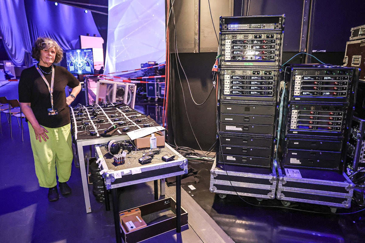Hinter der Bühne war direkt am Eingang eine mit schwarzem Molton abgedeckte Tischfläche eingerichtet und mit weißem Klebeband 32 Felder markiert worden. Jedes der Felder war mit einer laufenden Nummer und den Namen der Protagonisten markiert. In den Feldern lag jeweils ein Mikrofonset bestehend aus einem Sennheiser Kopfbügelmikrofon SL Headmic 1 und einem SK 100 Taschensender. Ein Windschutz für die Mikrofone war nicht vorgesehen, da es im Studio windstill war. Die Racks mit den Tonempfängern befanden sich direkt nebenan.
