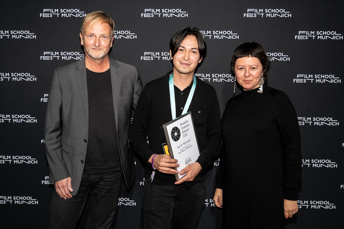 Preisträger Ian B. Morales mit Jury-Mitglied Olga Caspers und „Film & TV Kamera“-Chefredakteur Uwe Agnes (Foto: Filmschoolfest Munich)