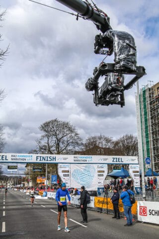 Der etwa 30 Meter nach dem Start auf dem breiten Grünstreifen zwischen den Fahrbahnen auf einer Schiene stehende Panther Pixy Crane mit einem etwa sechs Meter langen Ausleger, Grass Valley 4000 Kamera, Freefly Gimbal, Verkabelung sowie Bedienplatz, musste nach dem Start des Halbmarathons von der Südseite auf die Nordseite des Grünstreifens vom Friedrichwall hinter die Ziellinie umgebaut werden.