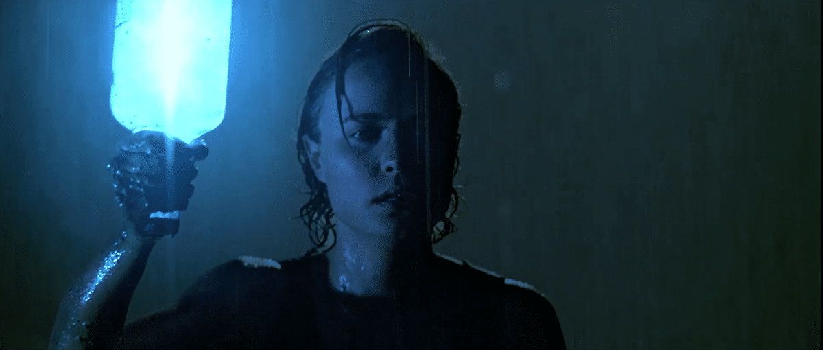 Filmstill aus „Pitch Black“: Die Flasche ist mit Leuchtstä- ben gefüllt, das Licht auf den Schauspieler wird von einer versteckten Kino-Flo-Röhre geworfen.