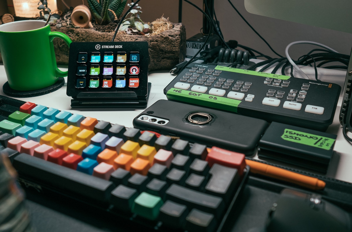 Am iMac angeschlossen ist das Blackmagic Ultra Studio HD, wo das Signal aus Adobe Premiere und Avid Media Composer vom iMac über USB-C eingespeist wird. Von hier geht ein HDMI-Signal an das BMD ATEM Mini. Ebenfalls per HDMI mit dem ATEM Mini ist die BMPCC4K verbunden, die als Webcam dient. Zudem sind zwei Thunderbolt-Hubs im Einsatz, um weitere USB-Anschlüsse zur Verfügung zu haben. Ismono spiegelt zudem seinen Desktop einmal in den ATEM Mini hinein, damit er dafür nicht die „Bildschirm teilen“-Funktion nutzen muss. „So geht es deutlich schneller und ich habe Kontrolle darüber, was ich wie zeige – kann mich selbst als Bild im Bild einblenden und das auch rausnehmen.“ Das macht er über ein Streamdeck von Elgato. Auf die Buttons hat er Makros gelegt, die er über die App Bitfocus Companion 2.1 programmiert hat und die Aktionen wie „Mikrofon Anschalten“ oder „Bild im Bild Einschalten“ übernehmen. Häufig genutzte Voreinstellungen sind das Vollbild des Porträt-Streams von Ismono, Vollbild des Premiere- oder Avid-Signals sowie das Vollbild plus kleiner Porträt-Stream von Ismono. Das Ganze wird per Tastendruck auf dem Streamdeck erledigt. Eine Änderung in MS Teams oder einer anderen Videokonferenzsoftware ist nicht nötig.