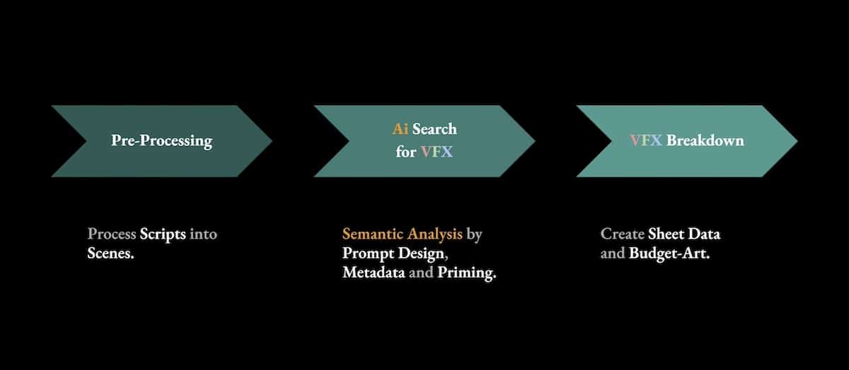 „Ich brauche ein System, das ein gewisses Maß an Verständnis dafür hat. Es muss Kontext, Bedeutung und Subtext verstehen können“, so Kay Delventhal. Das LLM nutzt dazu semantische Analyse. Damit versteht das Modell nicht nur Worte und Sätze und deren Bedeutung, sondern kann auch im Kontext verschiedene Bedeutungen interpretieren. Der erste Schritt im Versuchsaufbau ist die Einspeisung des Drehbuchtexts in die Datenbasis von ChatGPT. Delventhal bereitet die Skripte vor, damit sie leichter von der KI verarbeitet werden können. Über die API sendet er die Skripte an ChatGPT, das ist auch der einzige Weg, über den diese Inhalte nicht zum Training der KI genutzt werden. Dann erfolgt die Suche nach den VFX durch das LLM durch se- mantische Analyse der Skriptteile. Das wird gesteuert durch Prompt Design, dadurch hinzugefügte Metadaten und das Priming, also das Feintuning der Daten. Der dritte Schritt ist die Weiterverarbeitung der vom LLM extrahierten und interpretierten Daten für ein über eine Bild-KI erstelltes „Budget-Art“ oder einen VFX-Breakdown, zum Beispiel in einer Excel-Datei.