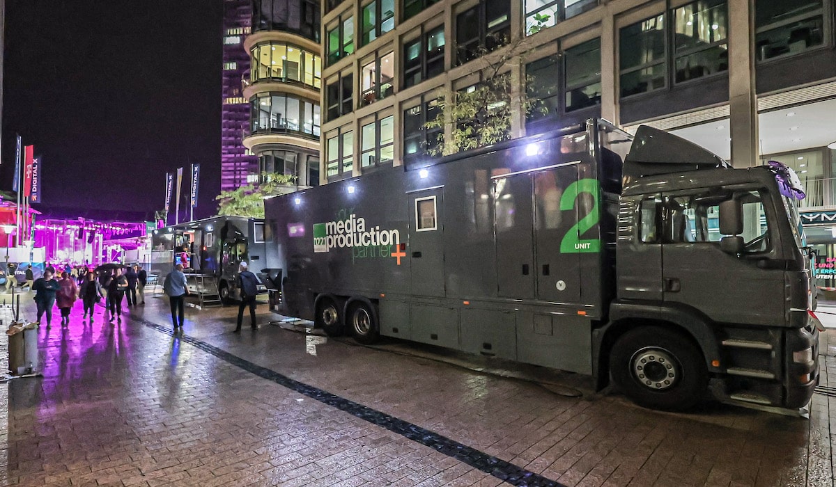 Der TV-Compound befand sich an einem der fünf Wege zwischen den Gebäuden, die sternförmig zur Plaza des Mediaparks führen. Dort standen in Reihe ein Wagen von MTI Teleport München, zuständig für die Glasfasernetzverbindungen, ein Transporter als Tonmobil von Live Nation sowie ein Rüst- und Ü-Wagen von der „0221 Mediagroup“ mit Sitz in Köln, die als ausgesonderte Fahrzeuge vom Hessischen Rundfunk Fernsehen erworben worden waren. Die beiden Lastwagen wurden innen renoviert und außen in anthrazitgrauer Farbe lackiert. 14 Arbeitsplätze teilen sich die Bereiche Bildregie, Bildtechnik, MAZ, Grafik sowie Audio- und Tontechnik.