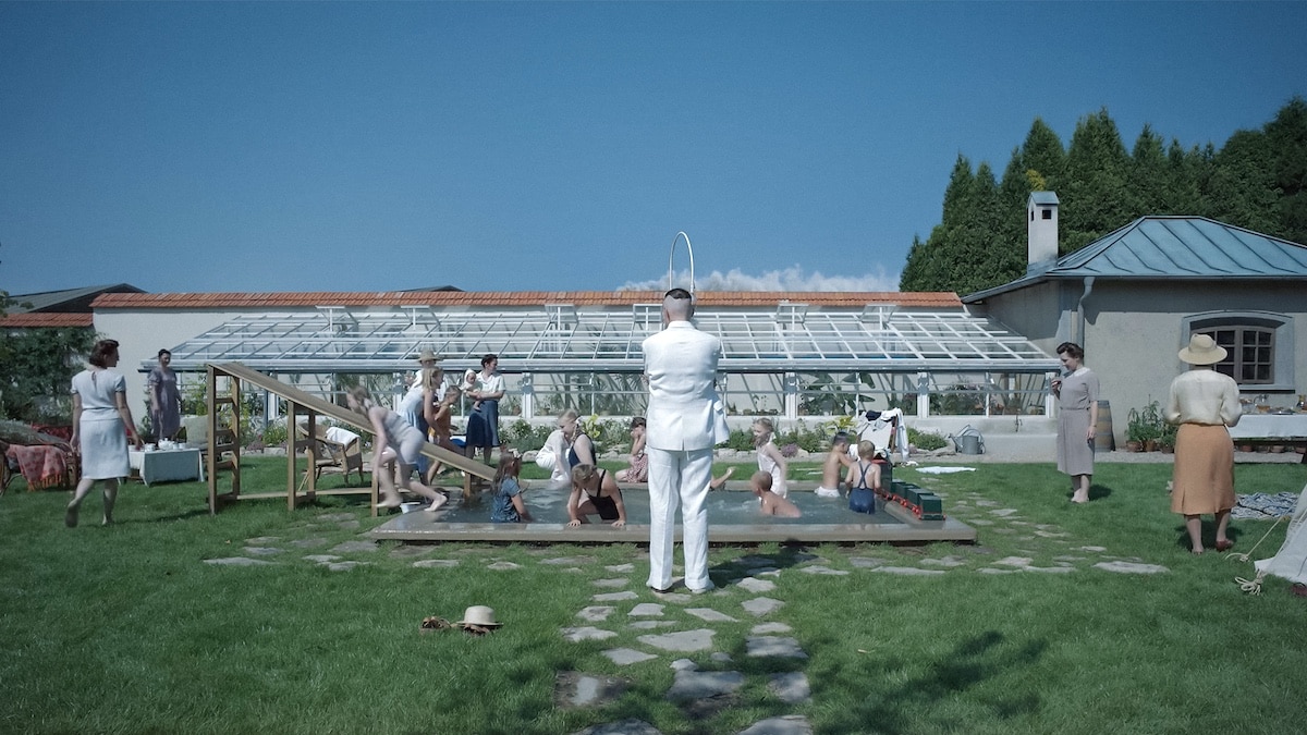 Oder wie William Goldman es ausgedrückt hat: „Niemand weiß irgendwas.“ Total. Ich liebe das. Wir fangen an zu drehen und sind auf der Suche. Ich denke es hängt davon ab, ob man sich auch ins Unbekannte vorwagt. Natürlich super vorbereitet und alles, aber dann muss man alles vergessen, was man weiß, dieses Wissen um die Technik und alle Lösungen – das schwimmt ja in mir, und dann kann man es hinter sich lassen und Neues entdecken. Was „Zone of Interest“ betrifft, so ist alles so einfach wie möglich kadriert, dass es gar nicht erst komponiert aussieht. Neutral, wie ohne Autor, immer im Zentrum, so wie das Auge selbst in der Mitte der Netzhaut sieht, am gelben Fleck. Dort ist die Auflösung am höchsten und man sieht am schärfsten, aber der goldene Schnitt ist das nicht. Wenn man jemandem ins Gesicht sieht, wie ich dir jetzt, dann ist über dir der Himmel und dein Kopf in der Mitte des Bildes. Für diesen Film war das die natürlichste Komposition, die direkteste. Wir waren super vorbereitet und hatten alles fotografiert. Allein der Prozess jeden Tag die Kameras einzurichten, hat sich jeden Tag verändert. Ich saß mit Johnathan Glazer vor zehn Monitoren, sah zehn Bilder an, wir sahen einander an und waren unzufrieden. „Was denkst du?“ – „Nein, das ist es noch nicht.“ Dann habe ich umgebaut, weil die Perspektiven nicht stimmten, und man noch einmal von vorne anfangen musste. Das habe ich dann zusammen mit meinem Schwenker Stanisław „Stachu“ Cuske besprochen und so lange korrigiert, bis es irgendwann stimmte.