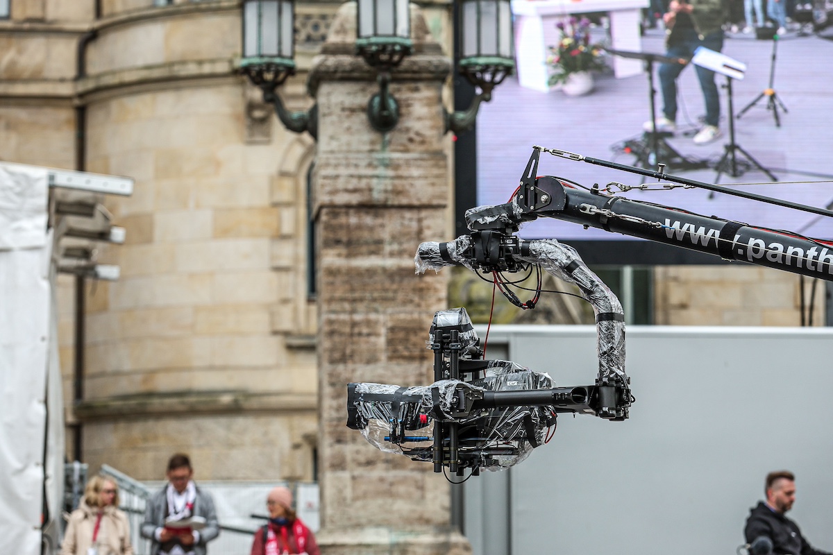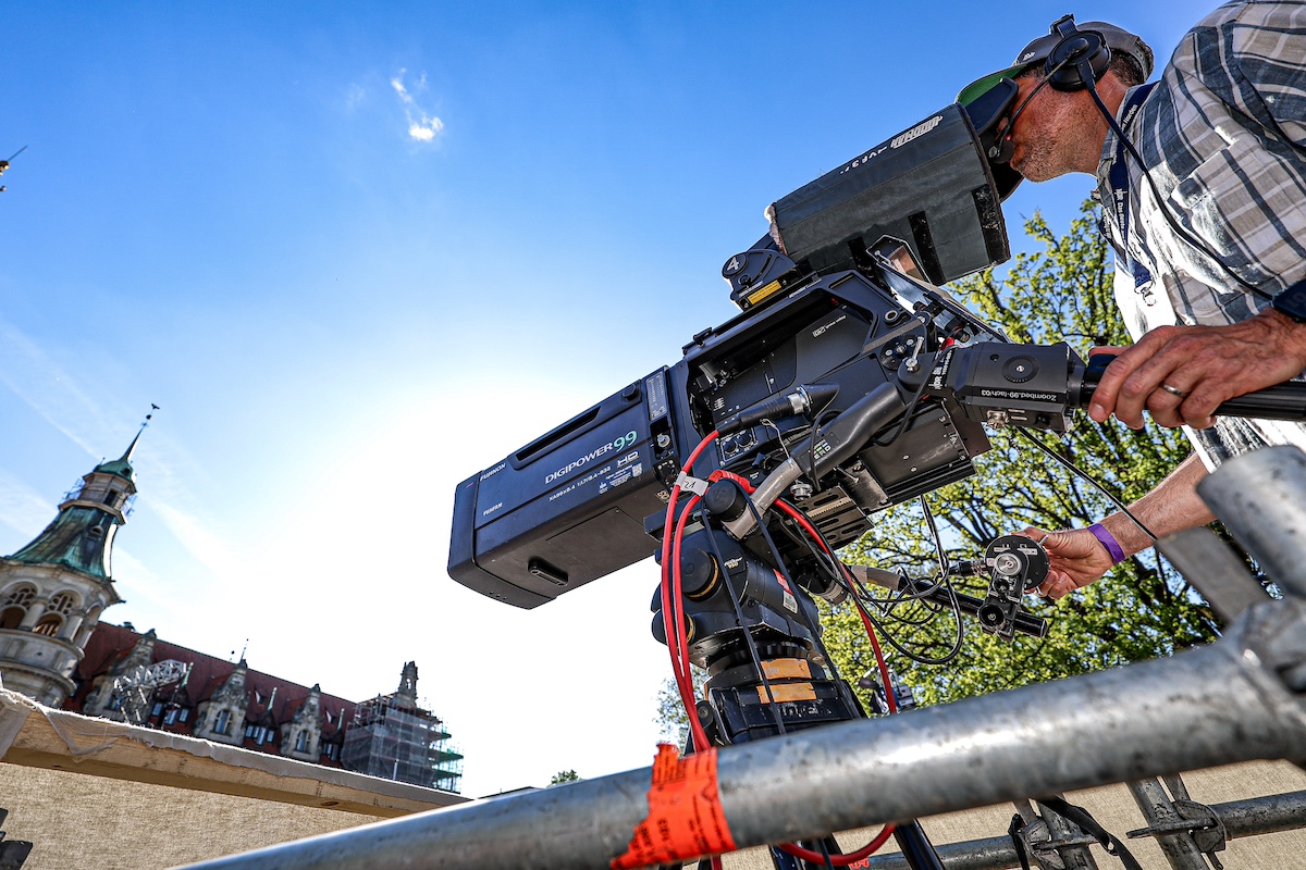 Für die Bild-Crews bot hingegen der Donnerstag die schwierigeren Bedingungen. Da die Bühne nach Süden ausgerichtet war und die Sonne bei bestem Frühlingswetter ab etwa 17 Uhr über dem Dach des Rathauses stand, gerieten die Protagonistinnen und Protagonisten ins harte Gegenlicht. Zwei ARRI 4-kW-Stufenlinsen waren deswegen hinter den Frontkameras positioniert worden, um Gesichter und Vordergrund aufzuhellen. Die beiden Bildtechniker an den CCUs hatten dementsprechend viel Arbeit, das HD-Bild nachzuregeln.