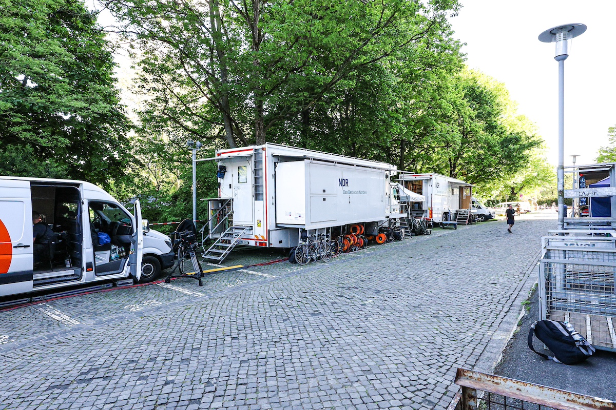 Der TV-Compound war in einer Sackgasse auf der Ostseite des Rathauses eingerichtet. Diese bot linksseitig Stellflächen für Fahrzeuge und verlaufende Gehwege zur Kabelverlegung. An vorderster Position stand ein Regie-Transporter des Dienstleisters MOO Video Productions, in dem die Streaming-Signale für verschiedene Onlineplattformen erzeugt wurden. Dahinter positionierten sich der NDR Ü1 sowie der begleitende Rüstwagen, über den ein Großteil der Kamera- und Signaltechnik organisiert wurde. Rechts davon befanden sich ein Schnittmobil und die NDR SNG D550 für die Satellitenanbindung.