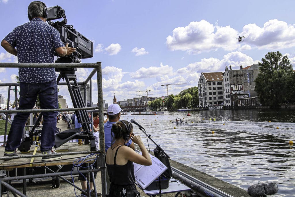 Am Sonntagmorgen findet der Triathlon-Sprint der Männer statt. Er beginnt mit der Schwimmstrecke im Strandbad Wannsee. Dort sind drei Kameras mit Boxoptiken auf Gerüsten und auf der Terrasse, drei drahtlose Schulterkamera, davon eine auf einem Motorboot und eine Kameradrohne im Einsatz. Dafür setzt der Dienstleister TVN aus Hannover eine DJI Matrice 600 Pro Drohne für die Live-Bildübertragung ein. Daran befindet sich ein stabilisierter 3-Achsen Brushless-Gimbal, in dem eine Sony HD-Systemkamera mit einer 18 bis 105 Millimeter Zoom-Optik montiert ist. “Die Übertragung des Bildsignals der Drohne erfolgt über eine Empfangsantenne, die auf der Terrasse positioniert ist. Von dort aus erfolgt die Signal-Anbindung über eine Stagebox via Lichtwellenleiter (LWL) zum Ü-Wagen”, erläutert Bastian Berlin von der TVN. Für den Einsatz der Kameradrohne sind der Drohnen-Pilot, der Kameramann und ein Bildtechniker verantwortlich. Für die etwa zehn Kilogramm schwere Drohne ist ein abgesperrter Start- und Landeplatz mit eigener Flugschneise Richtung Wasser notwendig. Der Flug der Drohne muss in Sichtweite des Piloten stattfinden. Selbst beim herrschenden Wind von 3,6 Metern pro Sekunde fliegt die Kameradrohne absolut stabil und liefert entsprechend ruhige Aufnahmen. Die Bilder des Kameramannes, der mit einer drahtlosen Schulterkamera ohne kardanische Aufhängung auf einer Aluminiumkiste in einem schwankenden Motorboot sitzt, wirken bei leichtem Wellen auf dem Wannsee im Vergleich eher schwankend. Schon zehn Minuten nach dem Start ist das sportliche Spektakel am Wannsee beendet und die Triathleten beginnen den nächsten Abschnitt des Rennens: 20 Kilometer mit dem Rennrad durch den Grunewald.