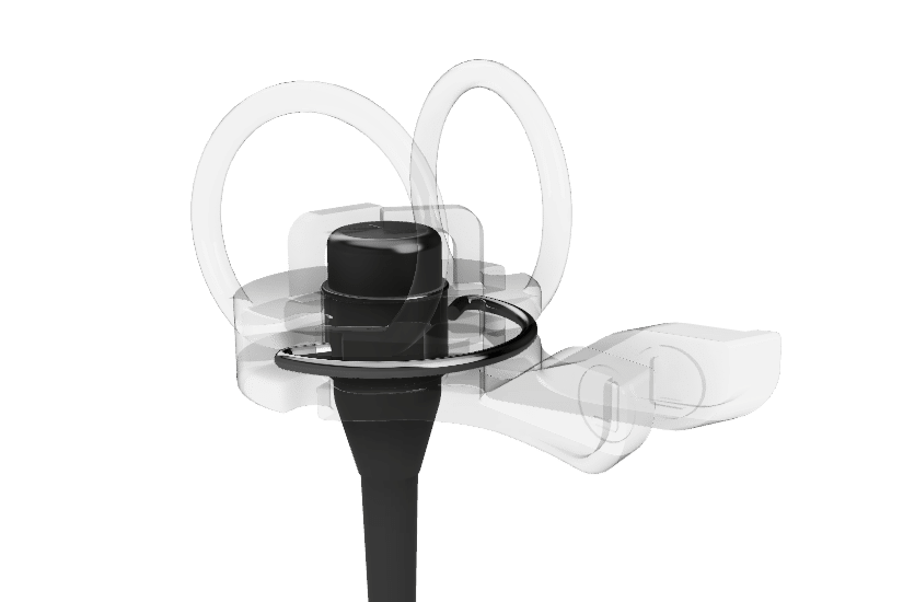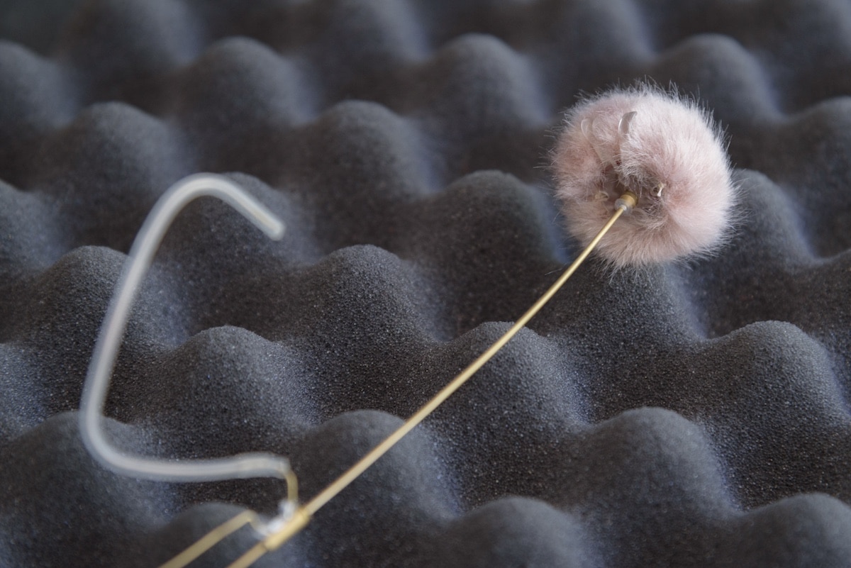 An die Klammer angesetzt sind zusätzlich Elemente, die für einen Lufthohlraum um die Mikrofonkapsel und für einen konstanten Abstand sorgen. Die Kapsel rutscht also nicht einfach ins Fell. Ein gleichbleibendes Luftvolumen um die Kapsel dient der definierten Windreduzierung und einer konsistenten Klangqualität. Diese stabilen Bögen und ein Mikrofonanschlag sorgen auch dafür, dass das Mikrofon im optimalen akustischen Sweet Spot positioniert bleibt. Man setzt die Kapsel einfach bis zum Anschlag ein – fertig. Sich das jetzt nicht noch jedes Mal genau ansehen zu müssen, beschleunigt den Einsatz enorm.