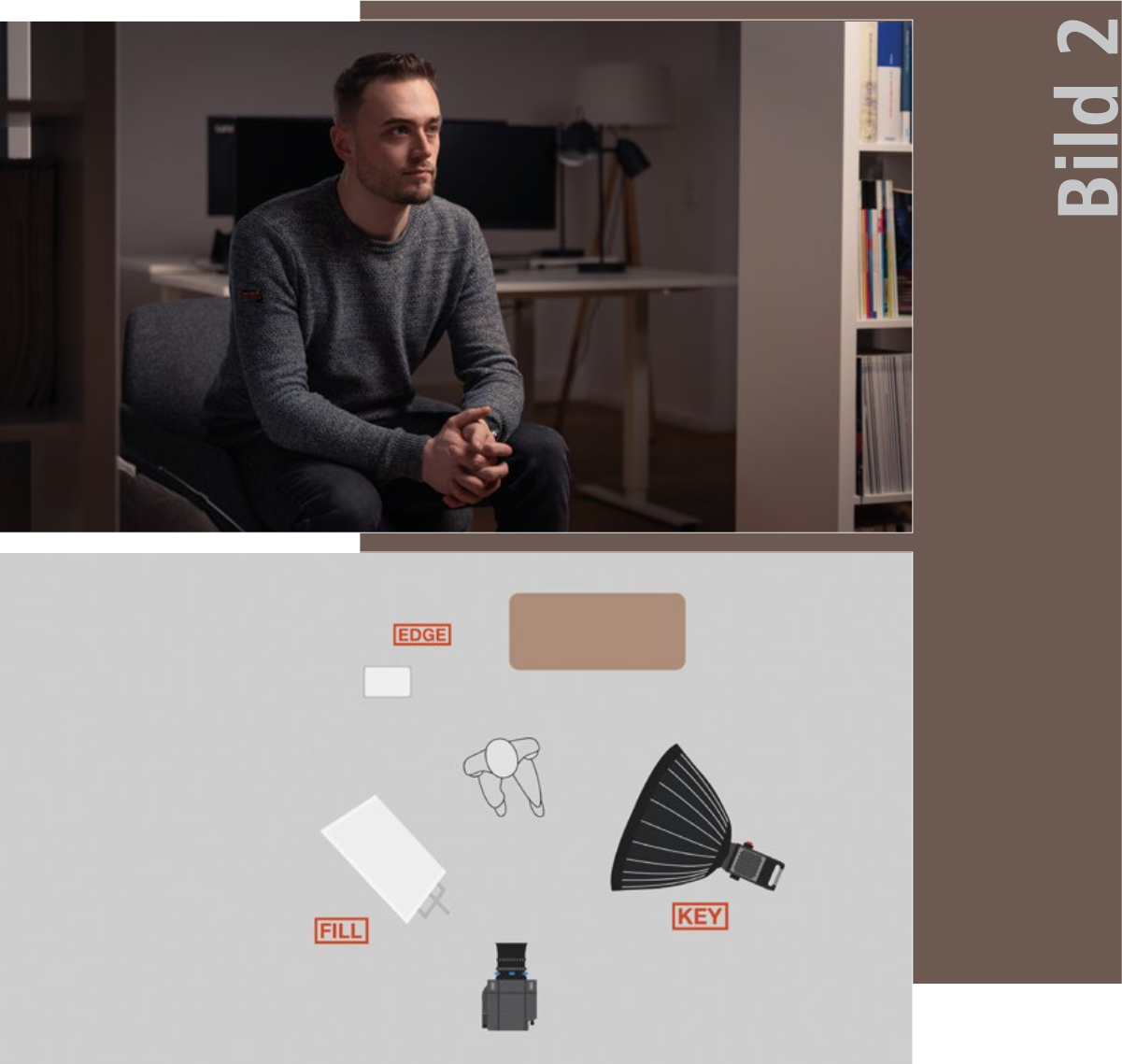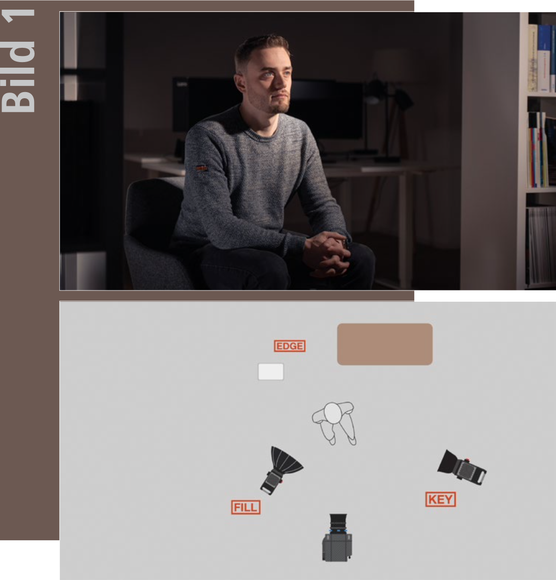 Für unser Tutorial zum Dreipunktlicht haben wir drei Beispiele des gleichen Grundsetups mit unterschiedlichem Licht gefüllt. Immer wird das gleiche Interview-Setup in den gleichen Büro-Räumen gezeigt. Für die maximale Lichtkontrolle sind alle Jalousien geschlossen. Für die Testbilder wurden die Amaran 60X S, die Amaran 300C, sowie die Aputure MC Pro mit den entsprechenden Lichtformern verwendet. Für die Visualisierungen wurden die Filmsetobjects benutzt.