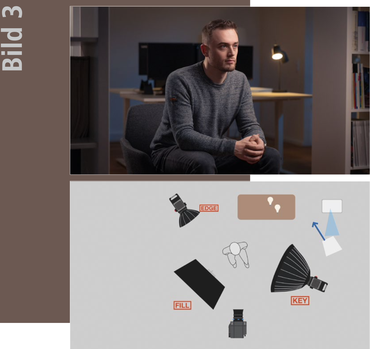Bild 3: Für dieses Bild soll das Maximum an Kontrolle und Tiefe im Bild entstehen. Es sind wieder drei Lampen zum Einsatz gekommen, allerdings wurde eine davon als separates Licht für den Hintergrund verwendet. Das Führungslicht ist nach wie vor eine große Softbox, allerdings diesmal mit einem Wabeneinsatz, damit sich das Licht nur auf die Person und so wenig wie möglich auf den Hintergrund und den Raum auswirkt. Das Aufhelllicht ist in diesem Fall kein Licht, sondern ein „Negative Fill“, also eine schwarze Flag, die möglichst viel Kontrast auf die linke Gesichtshälfte bringen soll. Grundsätzlich können dabei im Raum weitere schwarze Flächen zur Abdunklung installiert werden. Das Spitzlicht ist eine kleine Softbox mit Grid an einem COB-LED. Im Hintergrund wurden nun noch auf dem Schreibtisch stehende Lampen eingeschaltet, die als Practicals dienen und dem Bild mehr Tiefe verleihen. Ebenfalls mehr Tiefe soll das türkisfarbene MC Pro geben, das auf eine geknickte Spiegelpappe gerichtet ist. Diese Lichtfarbe soll einen Farbkontrast ins Bild bringen. [15533]