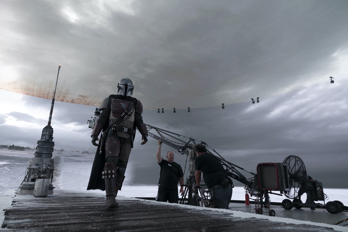 Pedro Pascal als Mandalorian mit Crew. Oben an der LED- Wand sind die kleinen Tracking-Kameras gut zu erkennen.