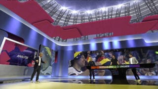 Mithilfe dieses Systems konnte man im Studiobild VIZRT-Grafiken als animiertes Stahlgerüst des Daches der Arena München in das TV-Bild einblenden und so den Eindruck er- wecken, man befände sich vor Ort. Der Übergang von realer Studiowand zum virtuellen Dach bestand aus den bekannten realen, jetzt aber virtuellen, Wandelementen in Magenta-Farbe. In einigen Szenen der Sendung hatten die Grafiker die kontrastreiche Kombination der Studiofarben in der virtuellen Darstellung etwas zu weit ausgereizt, so dass die Komplementärfarben nicht mehr zueinander passten. Die Reflexion der Farbe Gelb aus der virtuellen Deutschen Flagge färbte sogar die weißen Schuhe des Moderators und eines Experten im TV-Bild gelblich ein.