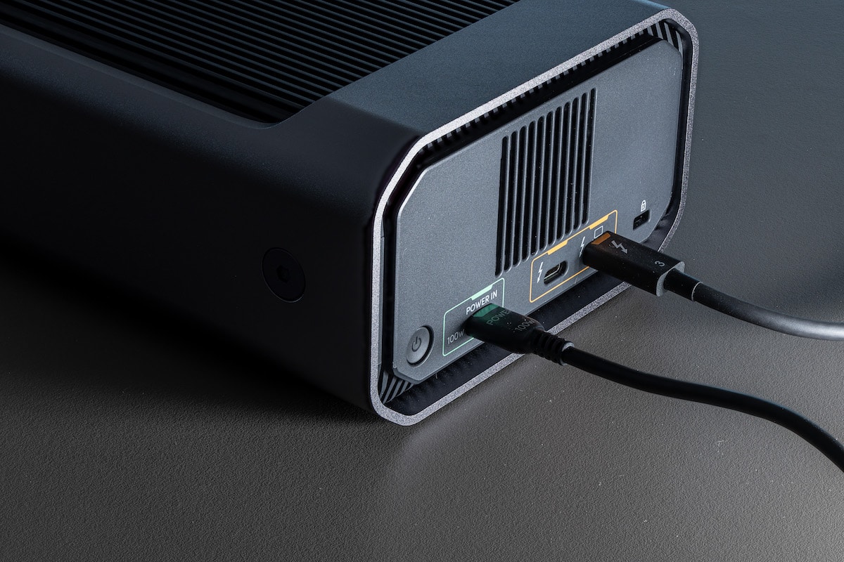 Nimmt man das System aus der Verpackung, so fällt sofort die hochwertige Verarbeitung ins Auge. Dafür sorgt nicht allein die Materialwahl, denn die Pro-Blade Station ist aus massivem Metall gefertigt. Nichts klappert. An der Vorderseite befinden sich die vier Einschübe inklusive je einer LED sowie eine LED-Leiste, die über den Status des Gehäuses informiert. Auf der Rückseite sind zwei Thunderbolt-3-Ports, ein USB-C-Stromanschluss, ein Kensington-Lock, der Power-Knopf und ein großzügig bemessener Lüfter. Nach dem Anschluss des Netzkabels und dem Einschalten der Station wird der Lüfter auch kurz hörbar und fährt danach wieder herunter. Die gute Kühlung soll eine permanent hohe Leistung ermöglichen und wird von SanDisk Professional als wichtiger Vorteil des großen Lesegeräts genannt. Wird ein Laptop angeschlossen, erhält er von der Pro-Blade Station Strom, allerdings nur bis zu 15 Watt. Davon lassen sich also leistungsfähige Geräte nicht beeindrucken, wenn man bedenkt, dass aktuelle MacBooks Netzteile von bis zu 140 Watt verwenden. Aber für einfache Copy- und Paste-Auf- gaben sollte es genügen, um einen Apple Silicon Mac zumindest nicht spürbar leerlaufen zu lassen.