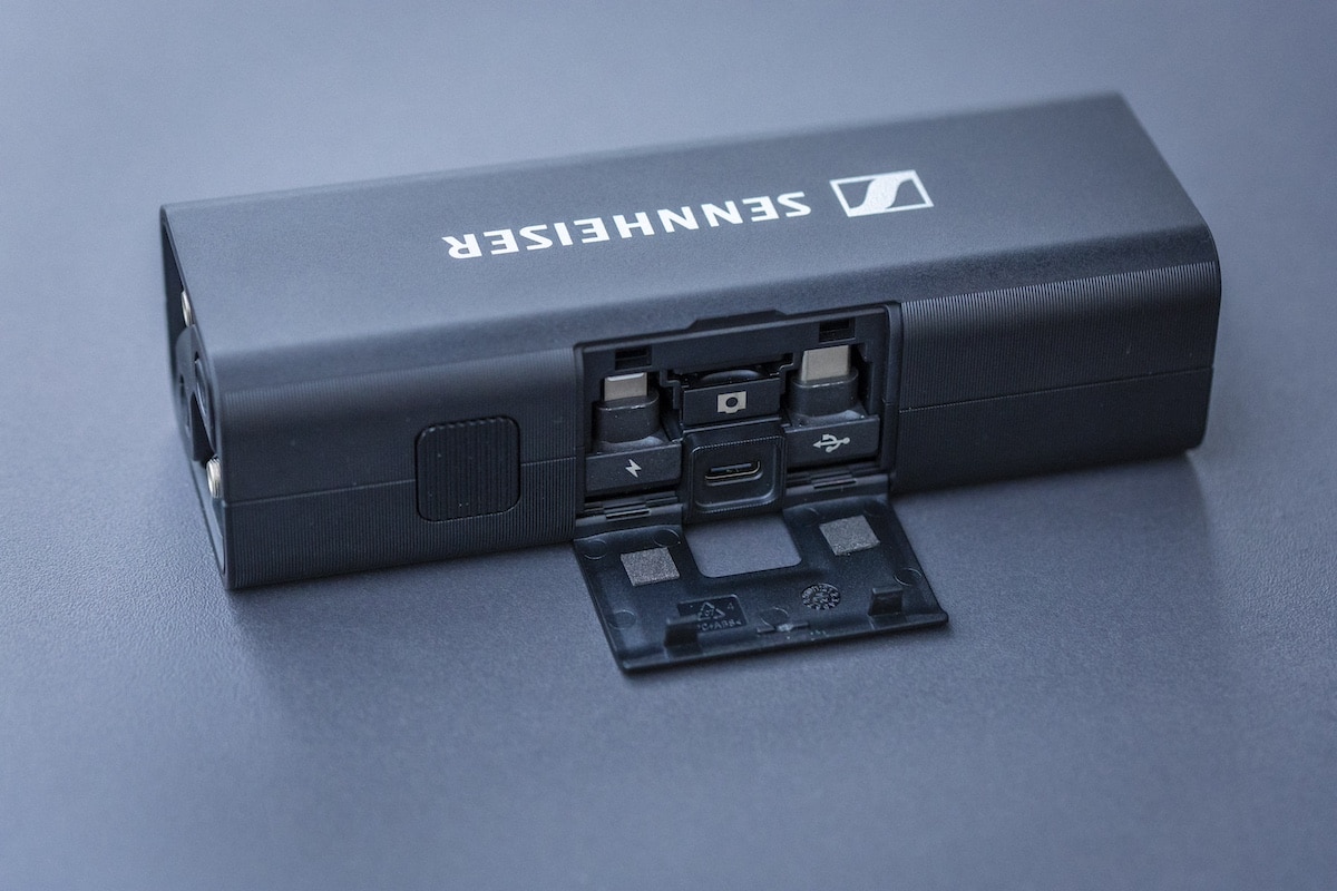 Nun bringt auch der deutsche Traditionshersteller Sennheiser mit dem Profile Wireless ein solches 2.4-GHz-System auf den Markt, das jedoch im Gegensatz zu den bereits am Markt bestehende Systemen von Herstellern wie Røde und DJI die Grenzen zu herkömmlichen professionellen Funksystemen verschwimmen lassen soll. Geliefert wird Profile Wireless in einem kleinen Textil-Case, in dem das Gerät selbst, ein USB-C-Kabel, ein Klinkenkabel sowie zwei Fellwindschütze zu finden sind. Das Profile Wireless ist ein kleiner Kasten, in dem – ähnlich wie bei gängigen Bluetooth-In-Ears – zwei Sender und ein Empfänger eingerastet und über Ladekontakte verbunden sind. Innen verbirgt sich noch ein weiterer Akku, der alle drei Komponenten gleichzeitig nachladen kann. Ebenfalls integriert sind zwei Magnete zur Anbringung der Sender an Kleidung, ein ¼-Zoll-Anschluss, ein USB-C-Ladeport und eine weitere Zubehörklappe. Dahinter verbergen sich dreierlei Anschlüsse für die Montage des Empfängers. Dieser kann nämlich an Geräte mit Lightning, USB-C oder Coldshoe bzw. ¼-Zoll-Schraube angeschlossen werden.