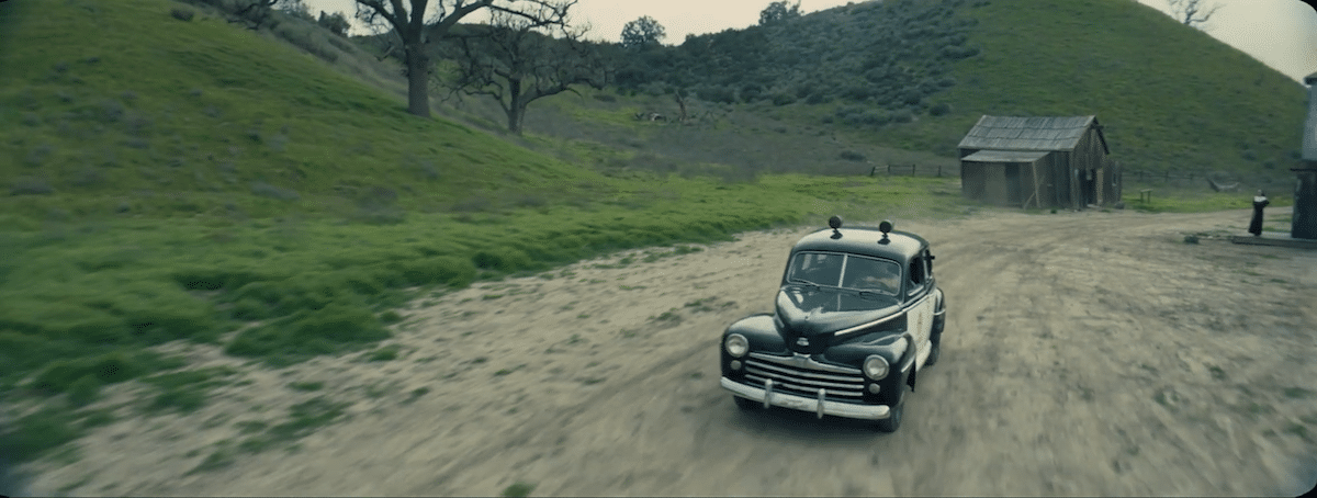 „Als ich das erste Mal von der Sequenz hörte, war ich völlig aus dem Häuschen“, sagt des Cognets. „Uns allen hier war sofort bewusst, dass das über unsere gewöhnliche Arbeit hinausgeht.“ Rafael Leyva war zudem wichtig, dass die Drohnenprofis ihren eigenen kreativen Ansatz mit einbrächten. Das ging so weit, dass Leyva bei ihrem ersten Gespräch nur erzählte, was in der Szene passiert. Der Sheriff reagiert auf einen Notruf und eilt im Auto zum Ort des Geschehens. Dann fragte Leyva die Drohnenexperten: „Wie glaubt ihr, könnte das durch eine Luftaufnahme emotional verstärkt werden?“ Das stachelte die Kreativität des Teams an. Der kurze Shot verfolgt ein Fahrzeug durch staubiges, gebirgiges Gelände auf ein Farmhaus zu. Die Aufnahme ist komplex, nimmt die Geschwindigkeit des Autos auf, folgt ihr, zieht weit auf, verändert die Höhe, taucht sogar zwischendrin unter einem knorrigen Baum hindurch. [15357]