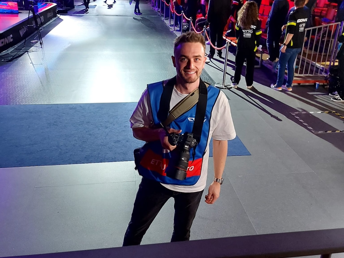 Redakteur Sven Kubeile unterwegs bei den Tischtennis-Europameisterschaften mit der Canon EOS R5 Mark II im Gepäck (Foto: Ursula Kubeile)