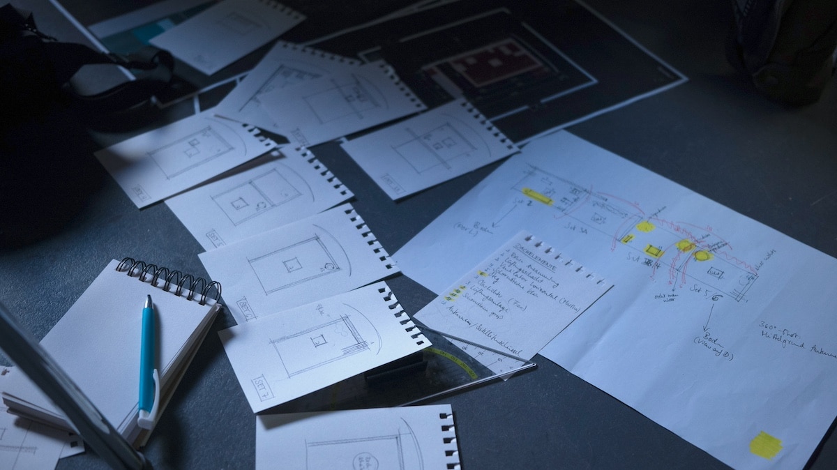 Diese Einschätzungsfähigkeit den Studierenden zu vermitteln, war auch eines der Hauptziele des Workshops. Denn Fragen entstehen im Laufe des Workshops wie von selbst und Lösungen müssen sich über die Grenzen einzelner Gewerke hinweg finden: Wie baut man ein Studio auf, um eine Integration der beiden Welten möglichst problemlos zu generieren? Welche Kamerabewegungen ergeben Sinn oder wie wird reales Licht digital verlängert und die Problematik mit Boden und nicht-vorhandener Decke gelöst? „Die Frage, ob eine virtuelle Produktion sinnvoll eingesetzt wird, ist eine konzeptionelle und dabei ist es zentral, dass die Kreativen ,Hands-on‘-Erfahrungen mitbringen“, so Thomas Stammer, Production-Design-Dozent des SEW. „Der filmische Raum soll als Gesamtfläche geplant und gestaltet werden.“ Somit war es von Anfang an Ziel und Aufgabe, eine gestalterische Konzeption zu entwerfen, die den Gesamtraum mit sowohl den realen als auch virtuellen Bereichen umfasst. Alle drei Departments waren aufgerufen, diesen gemeinsam zu erarbeiten und zu planen.