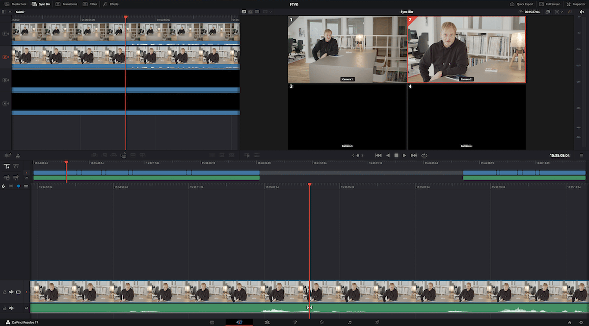 In DaVinci Resolve lassen sich alle Schnitte im Nachhinein bearbeiten. In der Cut-Page können über „Sync Bins“ alternative Aufnahmen synchron angezeigt werden.