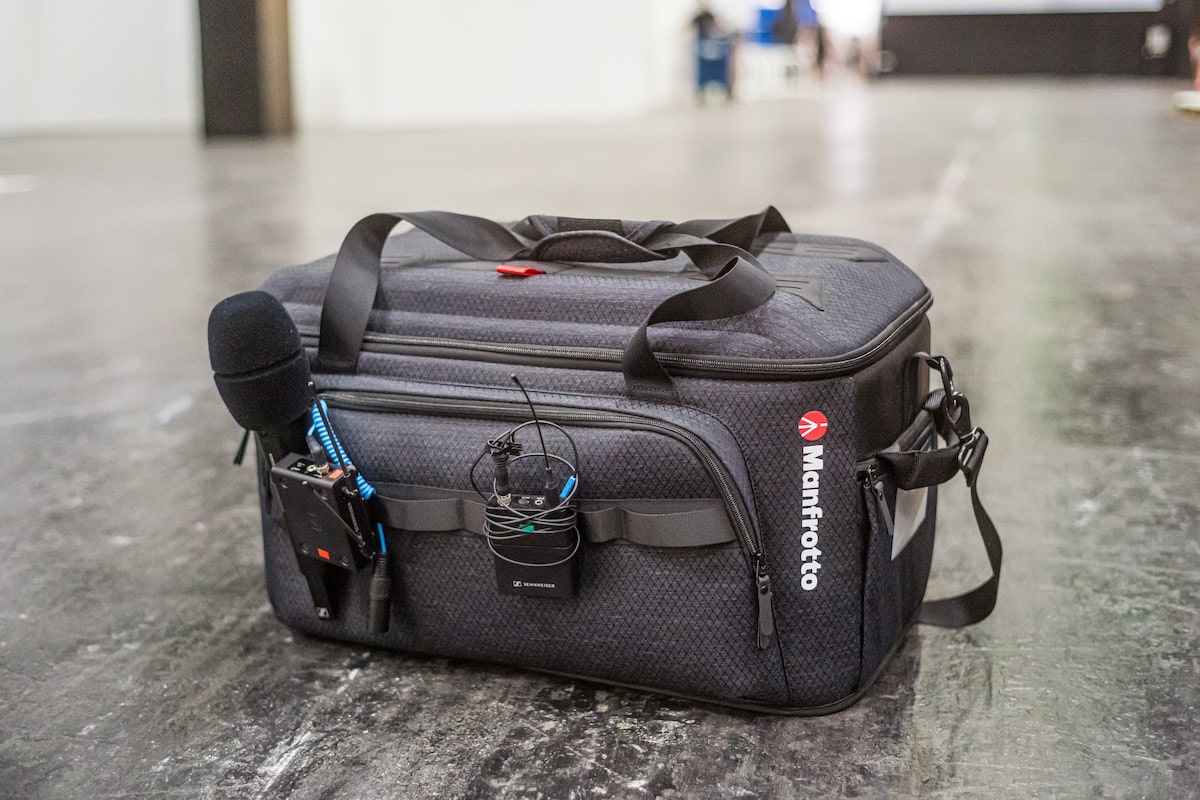 Manfrotto sieht die PRO Light Cineloader L als Kamera-Tasche für Filmproduktionen und als Zubehörtasche. Wir haben sie einige Tage bei einer Foto- und Videoproduktion auf der gamescom, der größten Spielemesse der Welt bepackt und ausprobiert und dabei alles in die Tasche geladen, was für professionelle Content-Produktion benötigt wird. Kameras, mehrere Objektive, Akkus, Ladegeräte, Schrauben und sogar ein Fotostativ fanden in ihr Platz. Besonders praktisch: Taschen- und Handsender ließen sich leicht zugänglich außen anbringen. Mit den Trageschlaufen konnten wir Tasche samt Inhalt dann über das gesamte Kölner Messegelände tragen und da wurde schnell klar: die Tasche ist zu schwer, um sie allein über die normalen Schlaufen, zu zweit über die Schlaufen an der kurzen Seite oder mit dem mitgelieferten Schultergurt zu tragen. Aber das liegt nicht an der Tasche, sondern einfach an der Art der Tasche. Wenn wir einen Trolley dabeigehabt hätten, hätten wir die Tasche einfach über die entweder unter dem Boden oder an der Hinterseite angebrachten Schlaufen daraufstellen können. Die Tasche ist zumindest in der größten Version und beladen also eher nicht dafür ausgerichtet, herumgeschleppt zu werden, sondern fühlt sich auf einem Magliner oder in einem Produktionsfahrzeug wohler. Sollte man dann doch mal zu Fuß unterwegs sein, kommt vielleicht besser eine kleinere Variante in Betracht – oder man nimmt zusätzlich einen Trolley mit.
