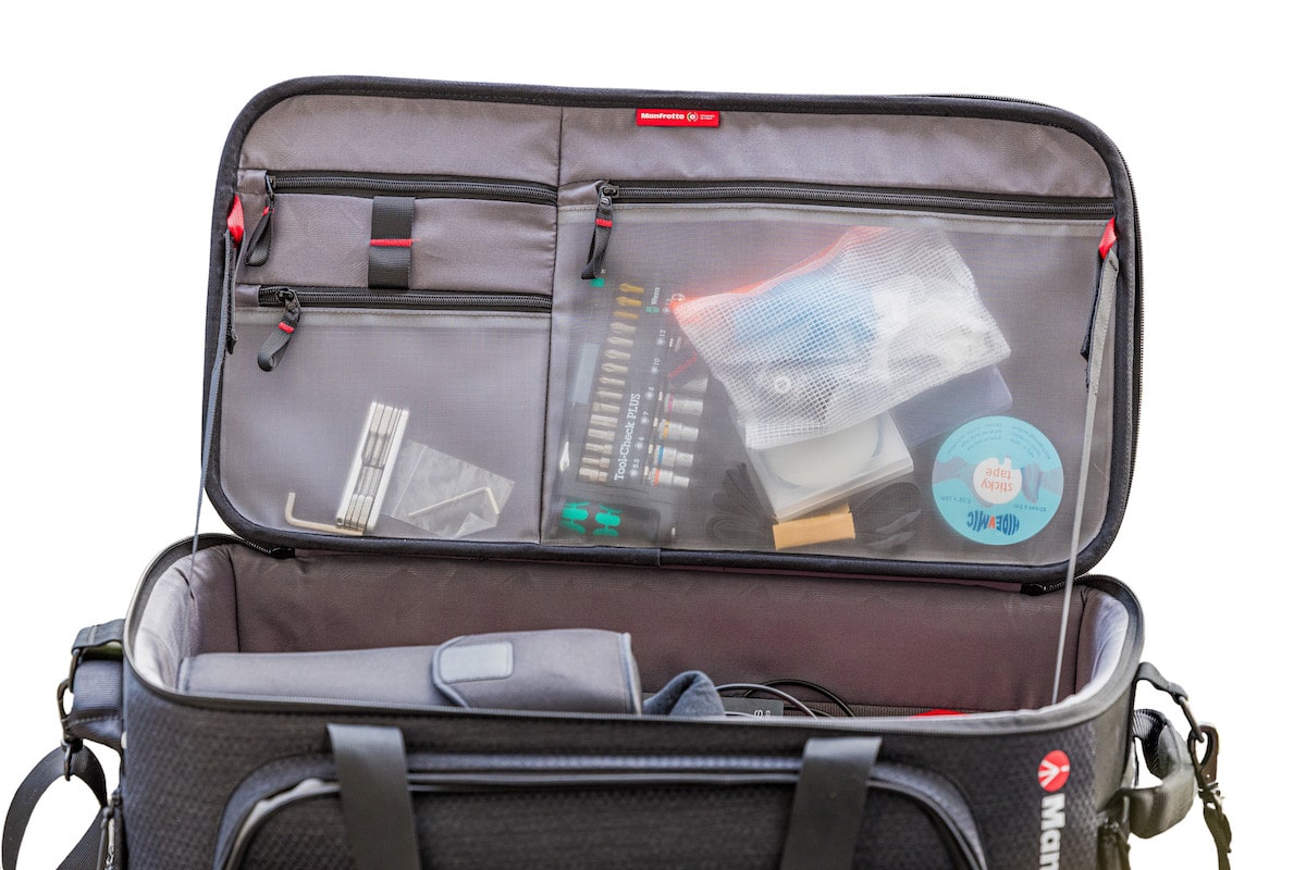 Wir haben die L-Version getestet, die für große Kamera-Setups wie der Canon C500 Mark II, den Blackmagic URSA-Ka- meras und der Sony FX6 und FX9 optimiert ist. Dabei liegt die mögliche Traglast bei bis zu 25 Kilogramm. Die Tasche besteht aus einem Mischgewebe aus Nylon und Polyester und soll auch kleinere Regenschauer abwettern können. Auf der Außenseite gibt es eine Vielzahl an Taschen: vorne eine mit unterschiedlichen Sortierfächern und außen angebrachten Schlaufen, hinten eine Dokumententasche mit AirTag-Fach und an den Seiten flache Taschen inklusive einer transparenten für Visitenkarten oder Typenschilder. Zusätzlich befindet sich auf jeder Seite eine Trageschlaufe, um die Tasche mit zwei Personen tragen zu können. Auf der Oberseite sind zusätzliche Schlaufen für die Befestigung von Stativen angebracht. Die dafür benötigten Befestigungsbänder sind ebenfalls im Lieferumfang enthalten. Innen gibt es Manfrottos eigenes Einteilungssystem M-Guard, das erlaubt, den Innenraum genau auf das eigene Equipment abzustimmen. Dabei sind die Einteil-Hilfen gleichermaßen weich wie stabil.