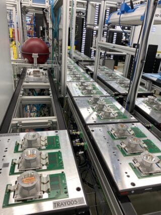 Danach folgt die Endmontage der Scheinwerfer. Dies geschieht von Hand durch erfahrene Fachkräfte, die jeweils einen Orbiter komplett fertigstellen und nicht etwa nur für einen begrenzten Umfang an Handgriffen verantwortlich sind. Letzter Schritt in der Fertigung der LED- Scheinwerfer ist der Ausgangstest, der von Prüfung der elektrischen Sicherheit bis zur Ansteuerung der drahtlosen DMX (CRMX) alle Funktionen abdeckt. Hierzu kommen die Orbiter wieder auf spezielle Trays, mit denen sie automatisch ihre letzte Station in der Fertigungshalle durchwandern. Ab der Bestückung läuft alles wieder automatisiert ab. Nach einem mehrstündigen sogenannten Burn-In – wichtig zur Fehlererkennung und Stabilisierung der LEDs – werden auch alle optischen Parameter mit mehreren Hundert Stützstellen getestet.