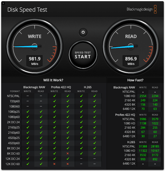 Die neue SanDisk Desk Drive gibt es ausschließlich mit 8 TB und 4 TB Speicherplatz, der fest im kompakten Gehäuse verbaut ist. Anschlussseitig stehen USB C und ein Hohlstecker-Anschluss für die Stromversorgung zur Verfügung. Außerdem ist ein Kensington-Lock-Anschluss verbaut. Die Geschwindigkeit wird vom Hersteller mit ungefähr 1 GB/s für Lesen und Schreiben angegeben. In unserem Test am Mac-Book Pro mit M1 Max ließ sich die Platte mit knapp einem GB pro Sekunde beschreiben, wohingegen sie sich mit knapp 900 MB pro Sekunde auslesen ließ.